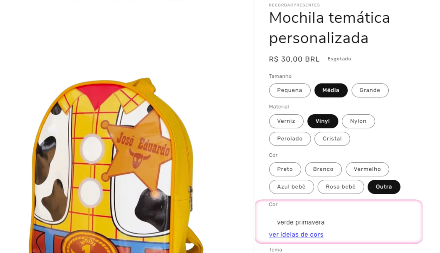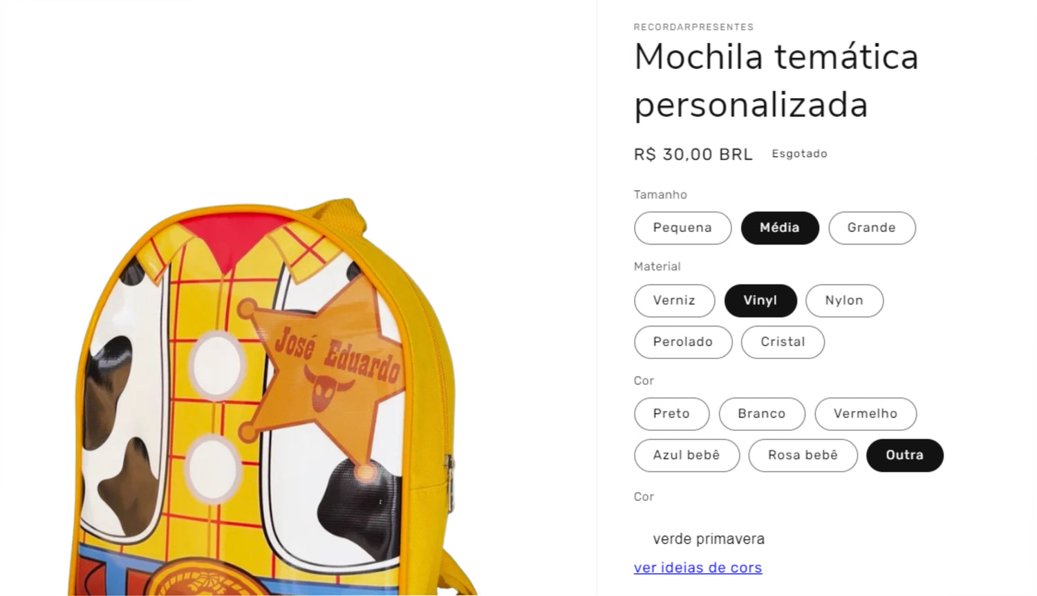 Na página do produto escolha o modelo na página produtos: selecione o tamanho e material