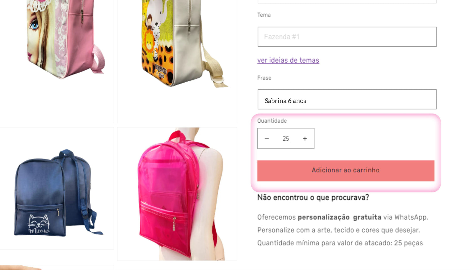 - A quantidade mínima para o valor de atacado é de 25 peças