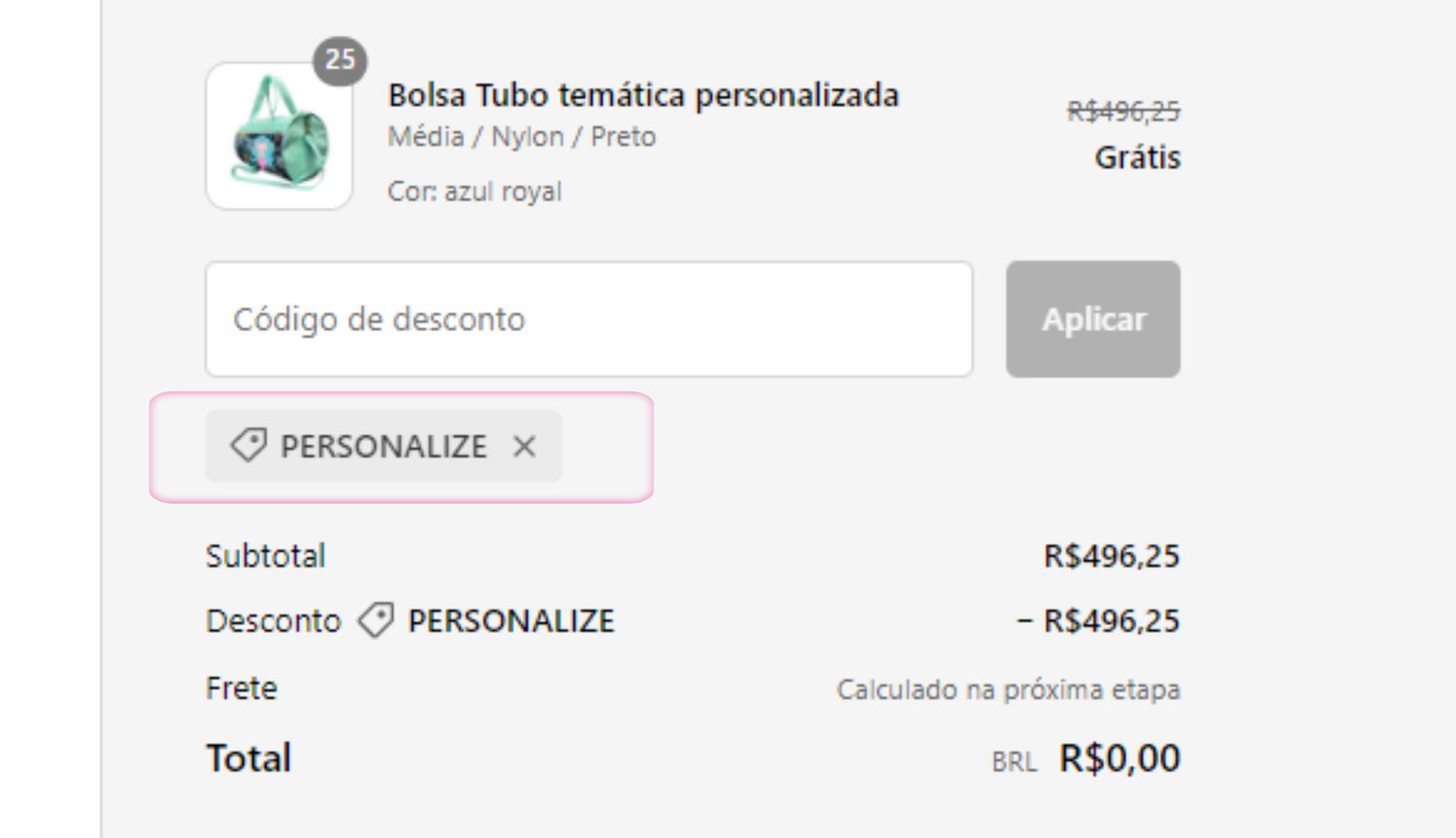 - Ao finalizar a compra no carrinho acrescente o cupom PERSONALIZE